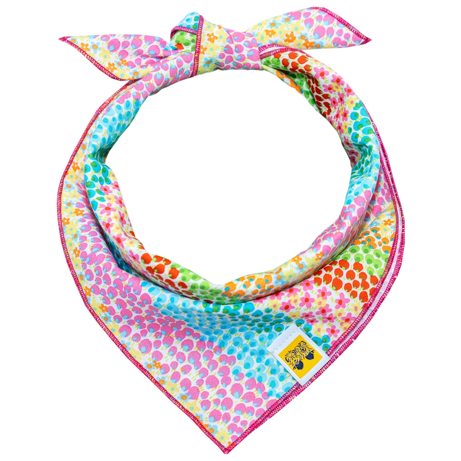 Bold, bright, beautiful. This multicolored print is filled with abstract floral dots dappled across the fabric like a flowing field of flowers. A perfect celebration of color for the fabulous pups in your life.