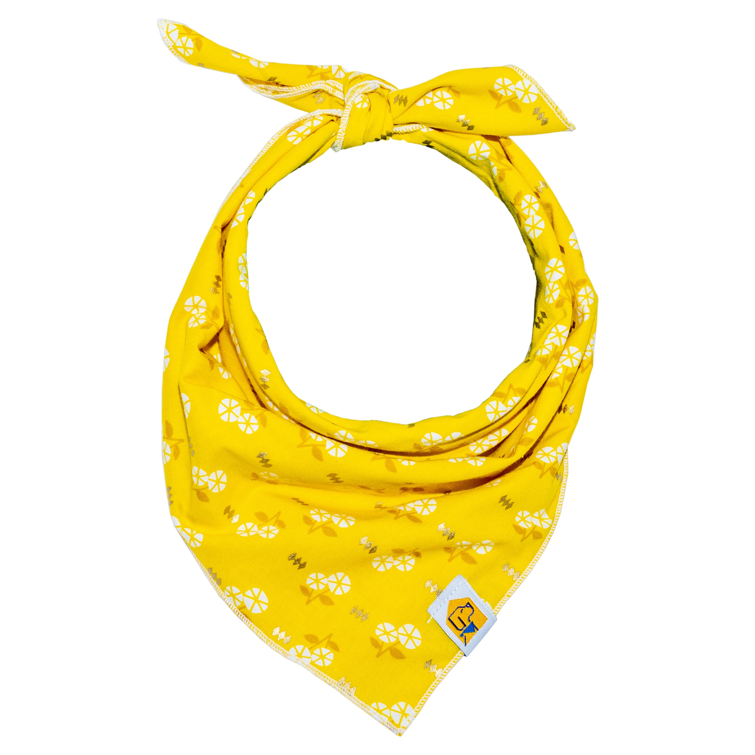 Bright yellow bandana with monochromatic daisy bunches and metallic details sprinkled across this bandana perfect for a sunshine filled day! A splash of sunshine added to your pup's wardrobe.