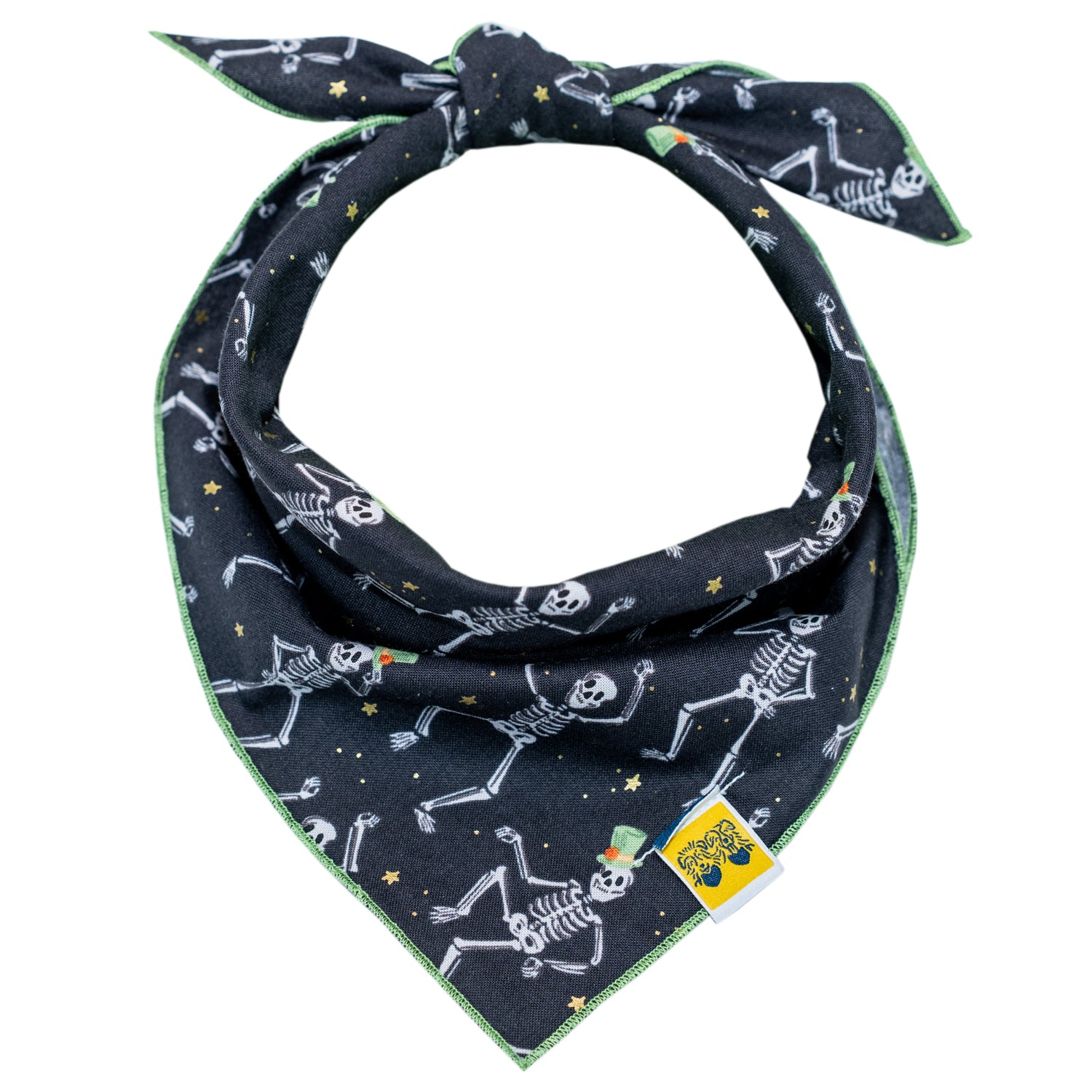 A festive little spooky print for the funky pal in your life. These dancing skeletons feature a bright green top hot and a matching poison-apple green edging. Get your Monster Mash on! Choose from a black or a cream background!