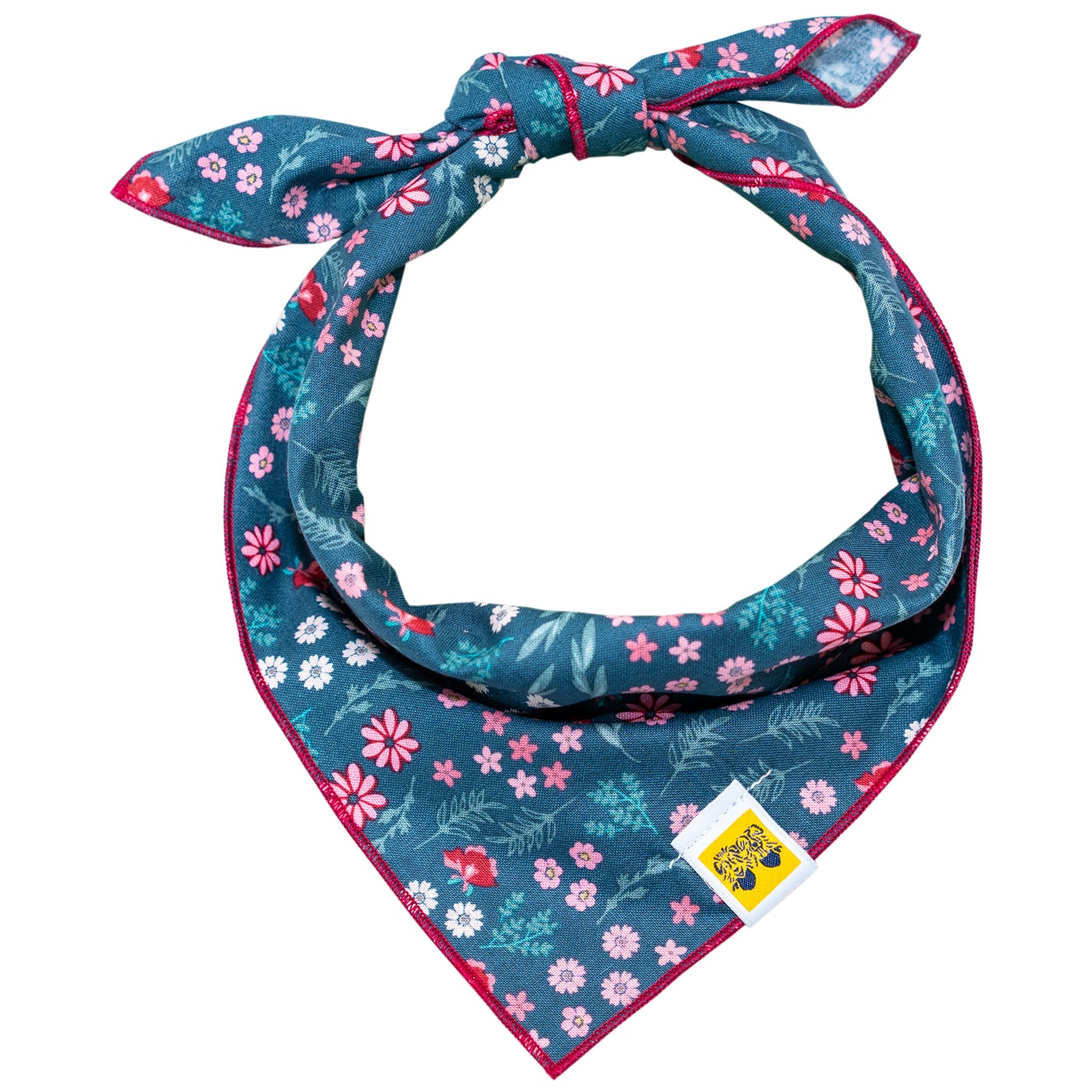 This floral print is a teal background color scattered with a ditsy pink flower pattern and its complementary vines. A fun little thicket scene printed on your pup's cute bandana. What more could you want for spring?