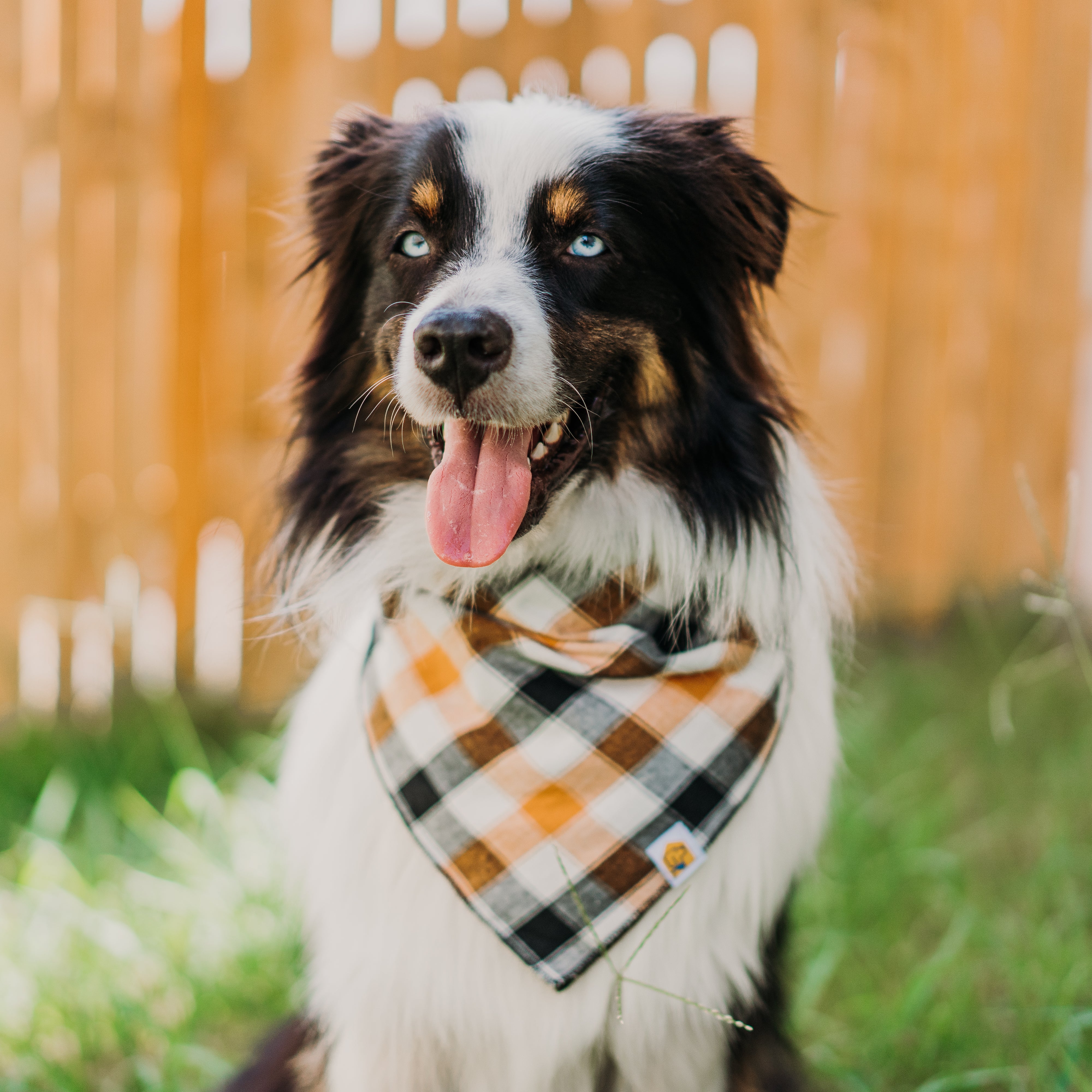 With large checks of black, cream and orange, this is the coziest your autumnal bandanas are gonna get. Perfect for any colored dog coat, in any season.