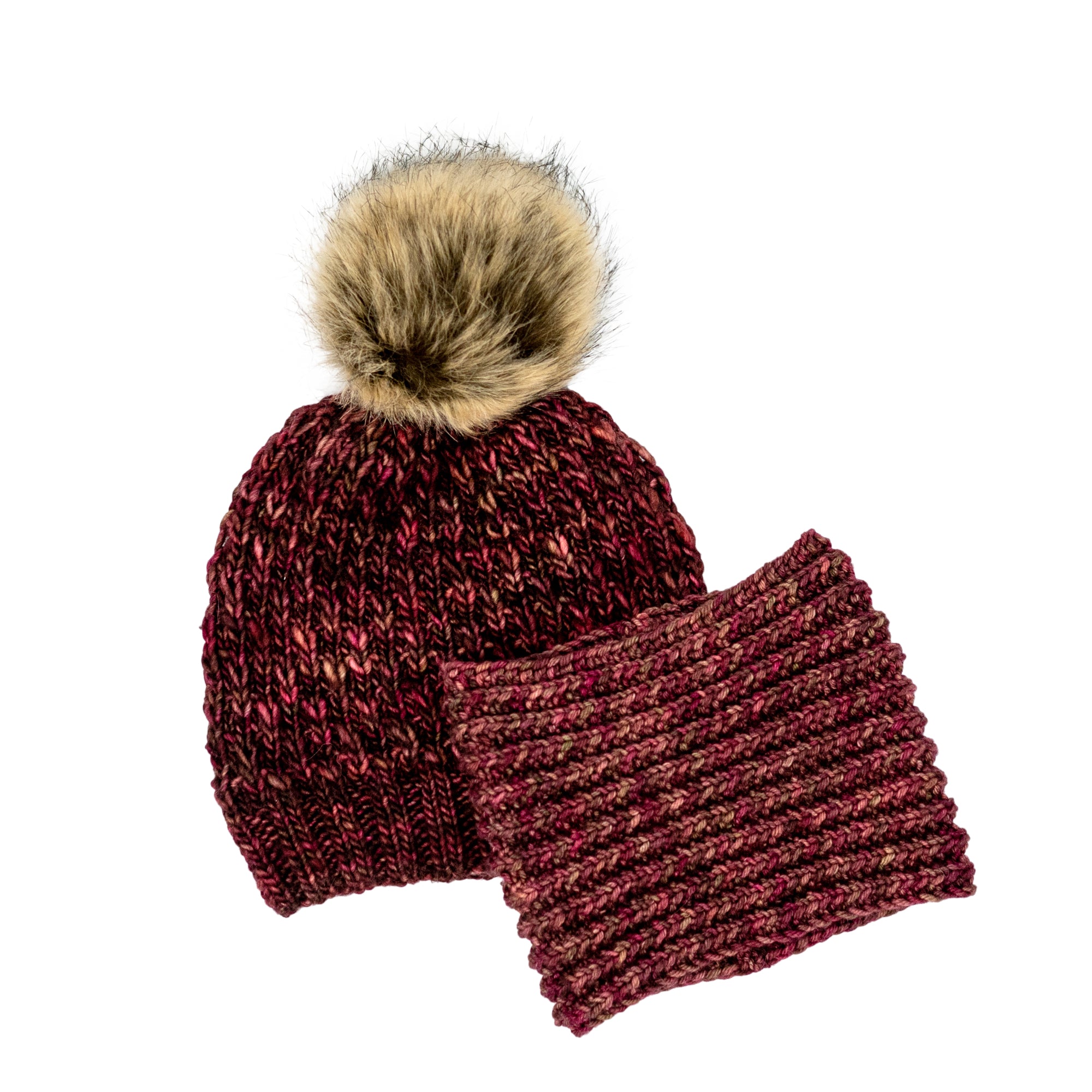 Warm, cozy shades of magenta and red make up this darling merino wool beanie and scarf set. The beanie is made with bulky Malabrigo yarn, while your pup's scarf is made with a lighter tighter-weight Malabrigo yarn in the same shade of Rio. Beanie is a Fits Most Adults Heads size and is topped with a large brown pom pom.
