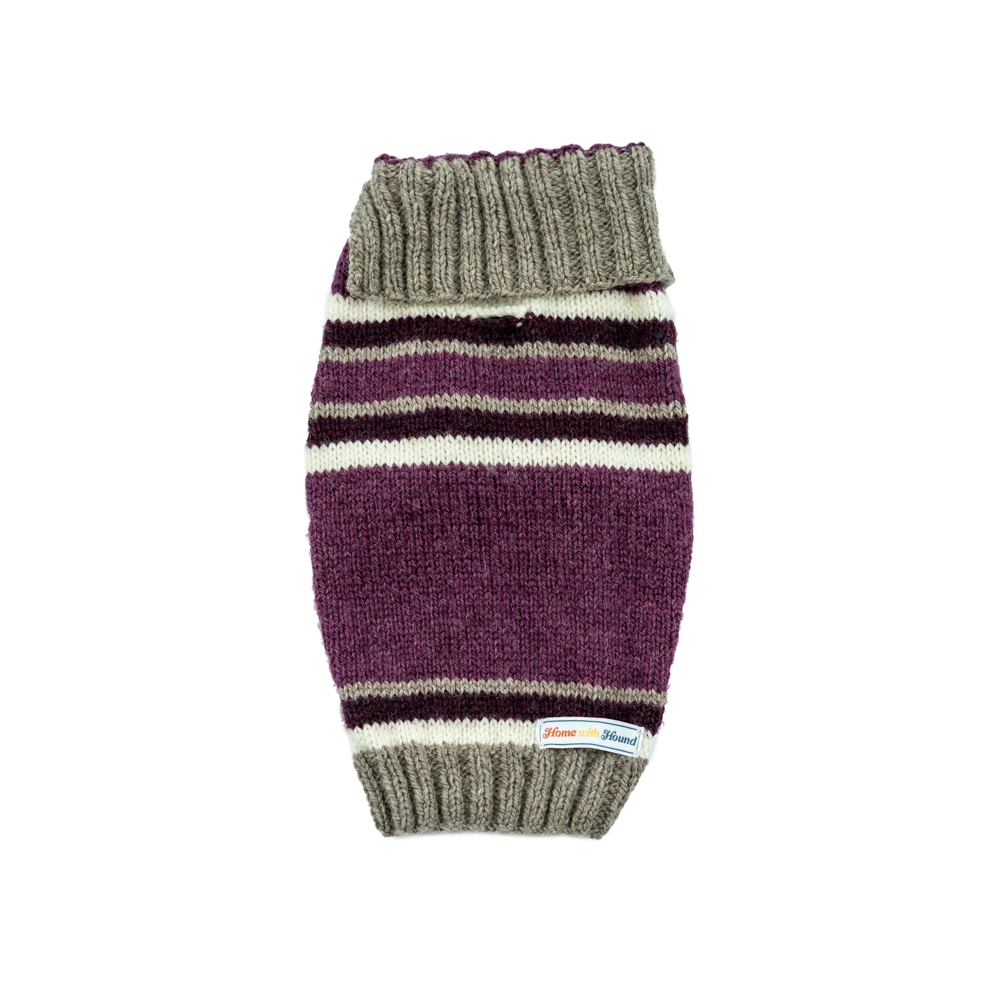 Keep your pup both cozy and charming in this Southwestern-style hand-knit dog sweater in size Medium. This letterman-striped sweater is in shades of purple, brown, and ivory cream. Wear the collar up, or fold it down, it's up to you. There is even a small hole for your dog's harness to be worn underneath if desired. The material has some give, so don't be afraid if it looks small. See below for sizing info. Don’t forget to measure your dog before ordering!