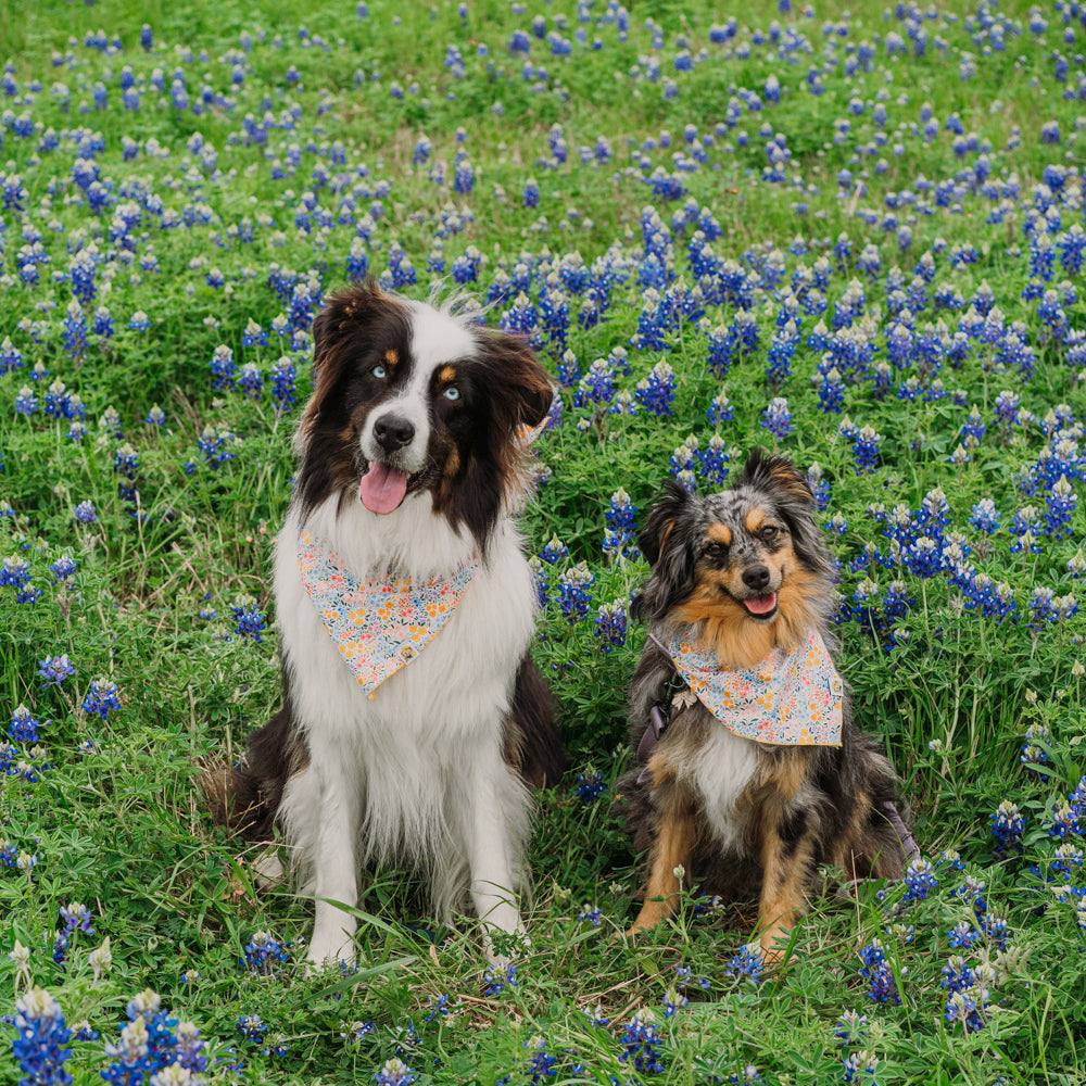 Bright Yellow edging frames this lovely springtime multicolored floral print. Bring the sunshine to you with this lovely little yellow and multicolored floral dog bandana!